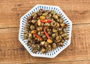 Literally any small, shelled mollusk found on beaches, streams and rivers, including any snails or crustaceans These are so small that they are considered worthless and untradable on the local market. This meal is usually eaten with bread or other available foods as the snalis alone are not filling enough. However, you eat what you can when you can.